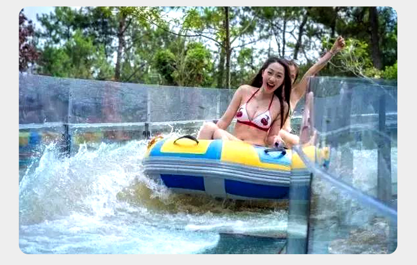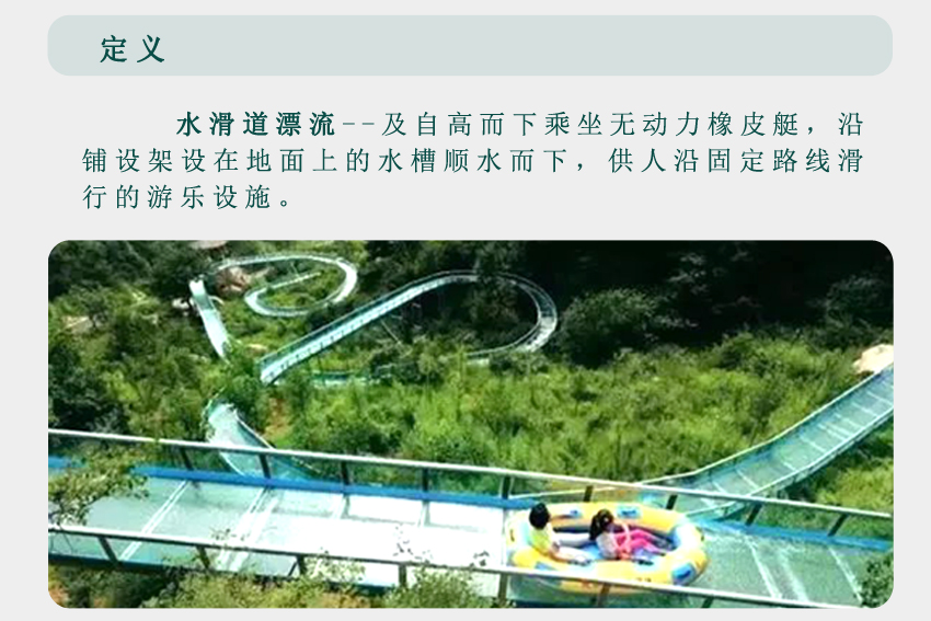 一是,依據(jù)大型生態(tài)漂流的體驗感,設計優(yōu)化升級而來。依地勢修建漂流槽,槽內(nèi)水深約20公分,水在漂流槽中托船順流而下,速度可控,刺激與安全兼得,確保百分之三百的安全。在設計上我們可以做到游客在漂流過程中基本不濕衣物。我們暫且稱這種形式的漂流為水滑道漂流。